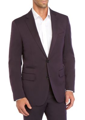 This New York cut three-piece suit stars in a deep eggplant hue with subtle texture. Suit SC size 56L - 58L EU 44L - 46L US. Tailored slim from soft mid-weight wool it features our signature one-button placement double vents patch pockets natural shoulder wide notch lapels and matching waistcoat.