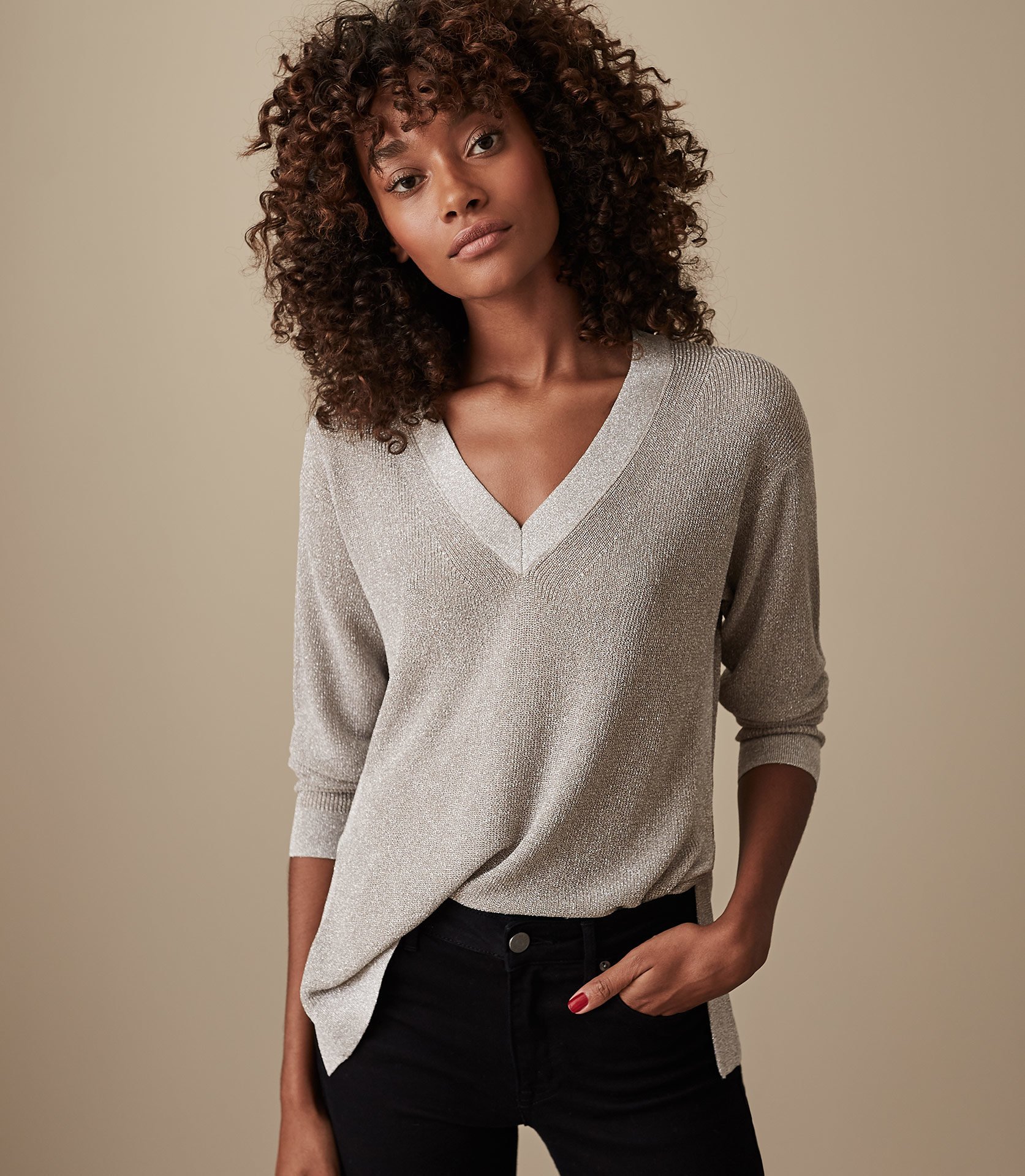 305 Carnival Metallic Jumper _ Silver Buy. Fine-knit longline jumper with metallic silver yarn Semi-sheer fabric Double V- neck and V back L. 1300 PP PP PP.